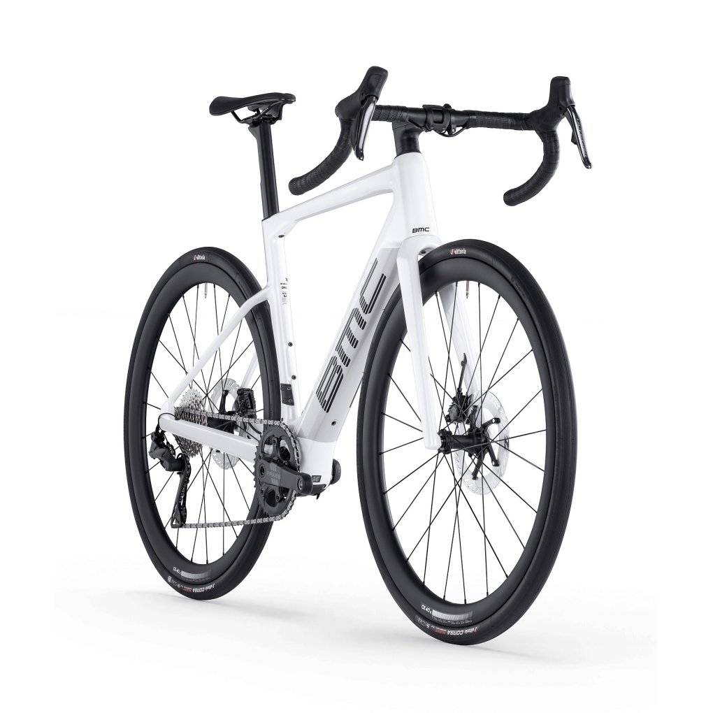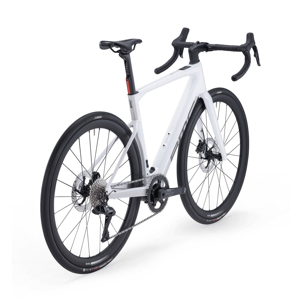 BMC Bikes ▶ Carbon E-roadbike with TQ drive unit/360Wh battery, 1×12-speed Shimano Ultegra Di2 & disc brakes. ▶ Model: metallic white