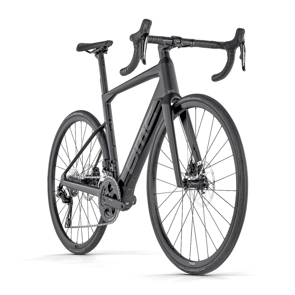 BMC Bikes ▶ Carbon E-roadbike with TQ drive unit/360Wh battery, 2×12-speed Shimano 105 Di2 & disc brakes. ▶ Model: carbon / metallic grey