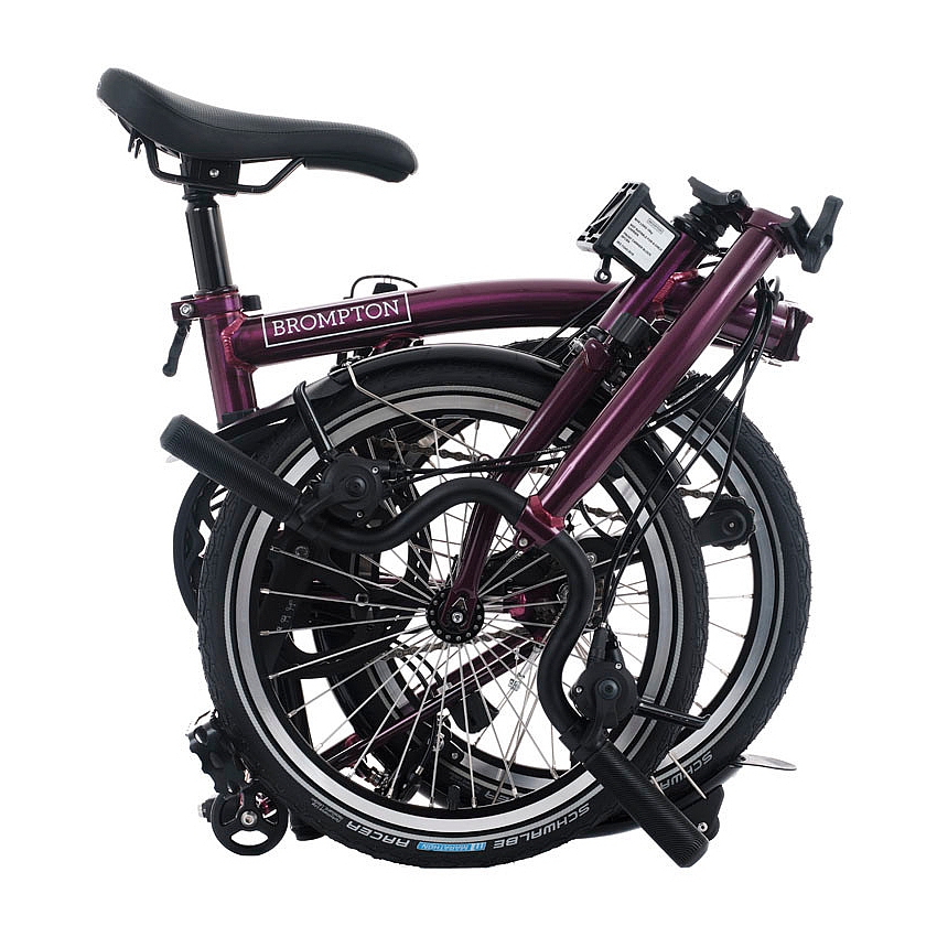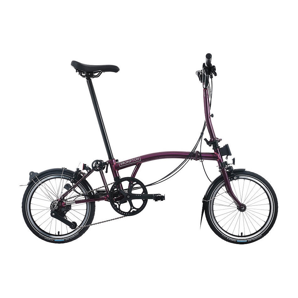 Brompton ▶ 16″ folding bike with 12-speed drivetrain, rim brakes, dynamo light, rear rack & mudguards. ▶ Model: amethyst lacquer