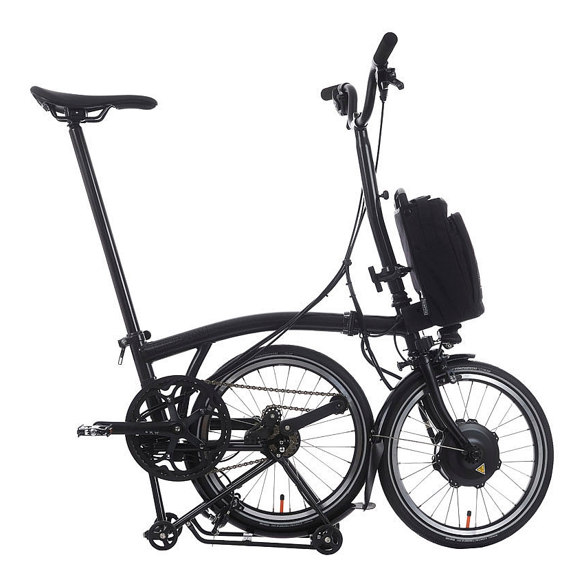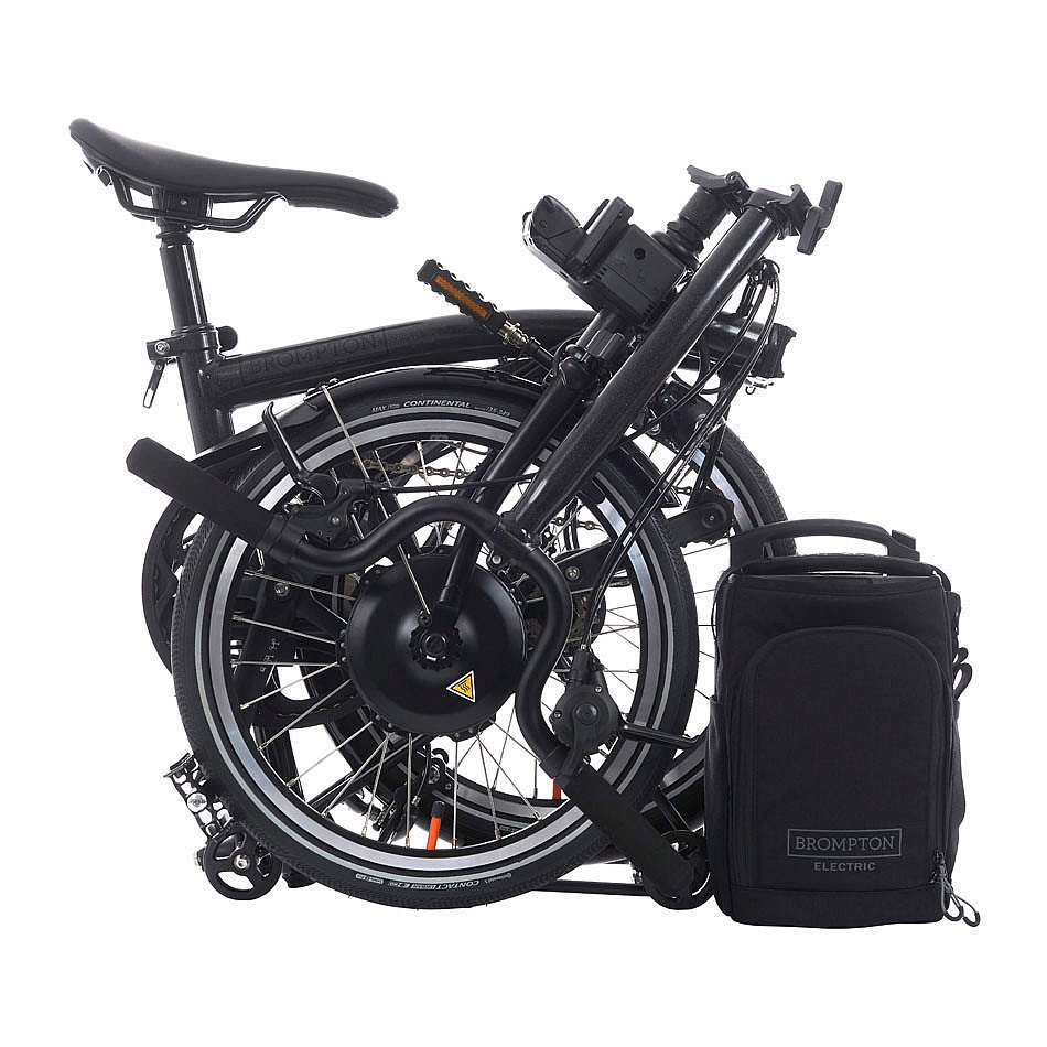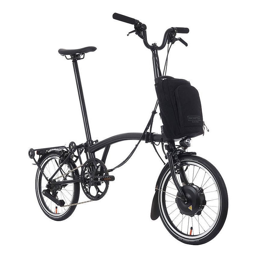 Brompton ▶ 16″ folding e-bike, front motor, 300Wh battery, 12-speed drivetrain, rear rack, light ▶ Model: matt black