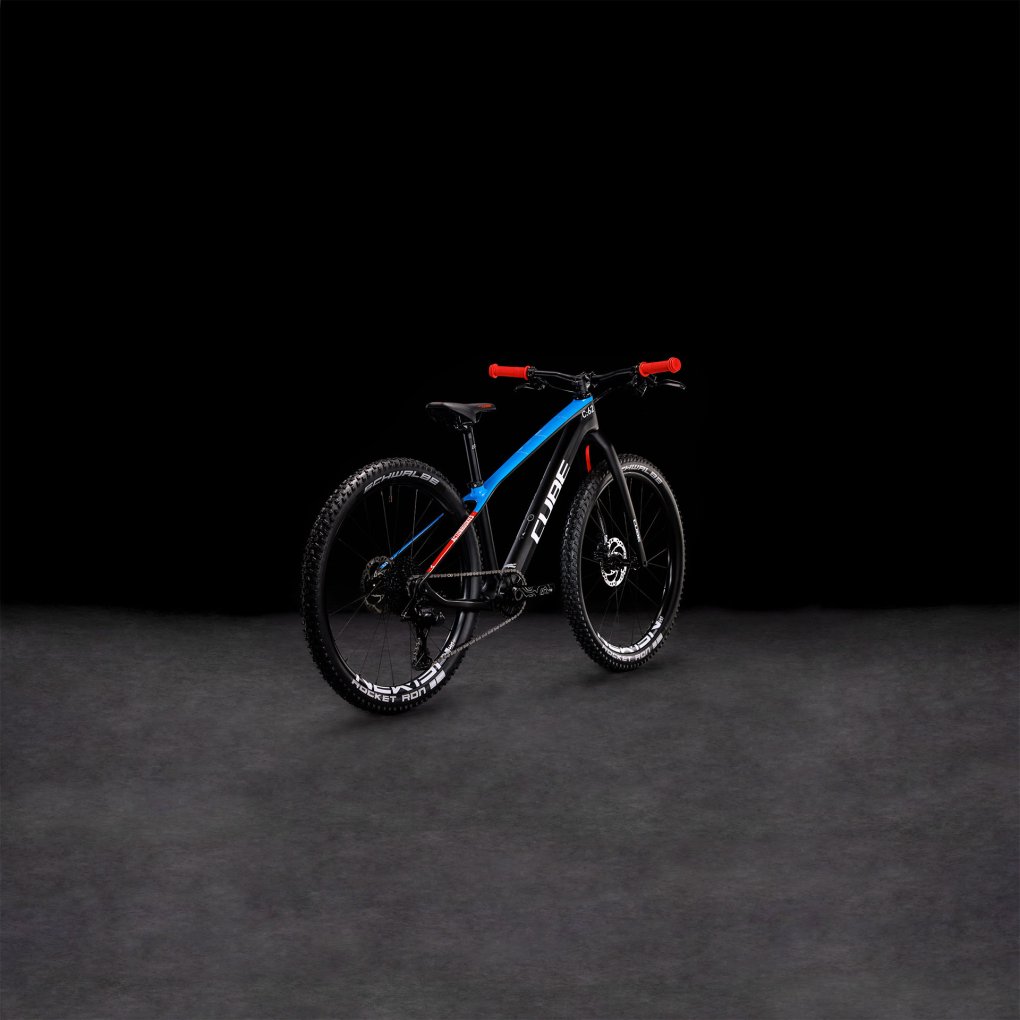 CUBE Bikes ▶ 24″ kids carbon MTB with 1×10-speed Microshift Advent, Magura disc brakes & Newmen wheelset. ▶ Model: carbon / blue / red