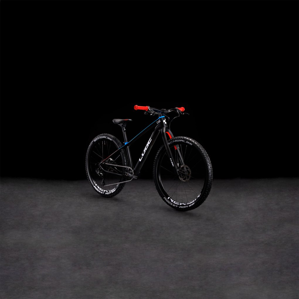 CUBE Bikes ▶ 24″ kids carbon MTB with 1×11-speed SRAM GX, Magura MT8 disc brakes & Newmen Evolution wheelset. ▶ Model: carbon / blue / red