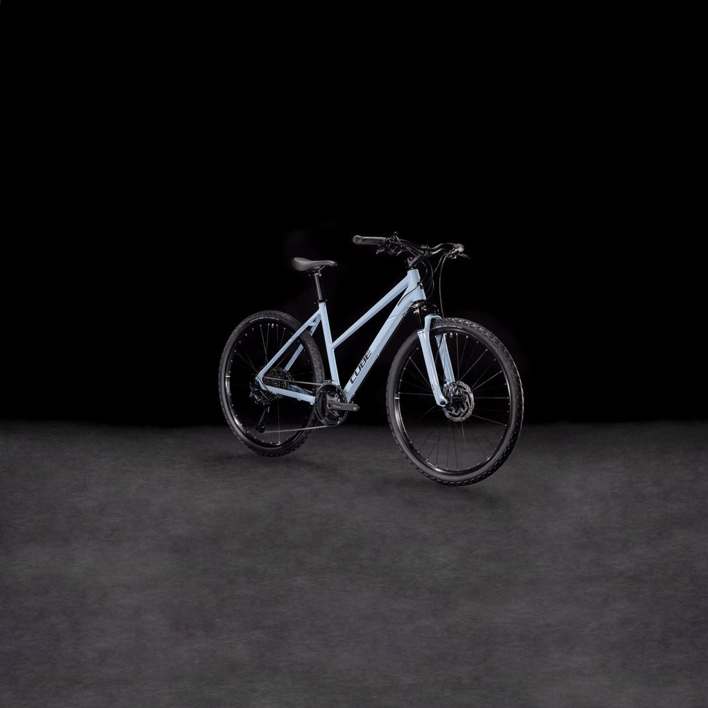 CUBE Bikes ▶ Women Crossbike with 2×11-speed Shimano Cues, Suntour suspension fork and Shimano disc brakes. ▶ Model: pigeonblue / black