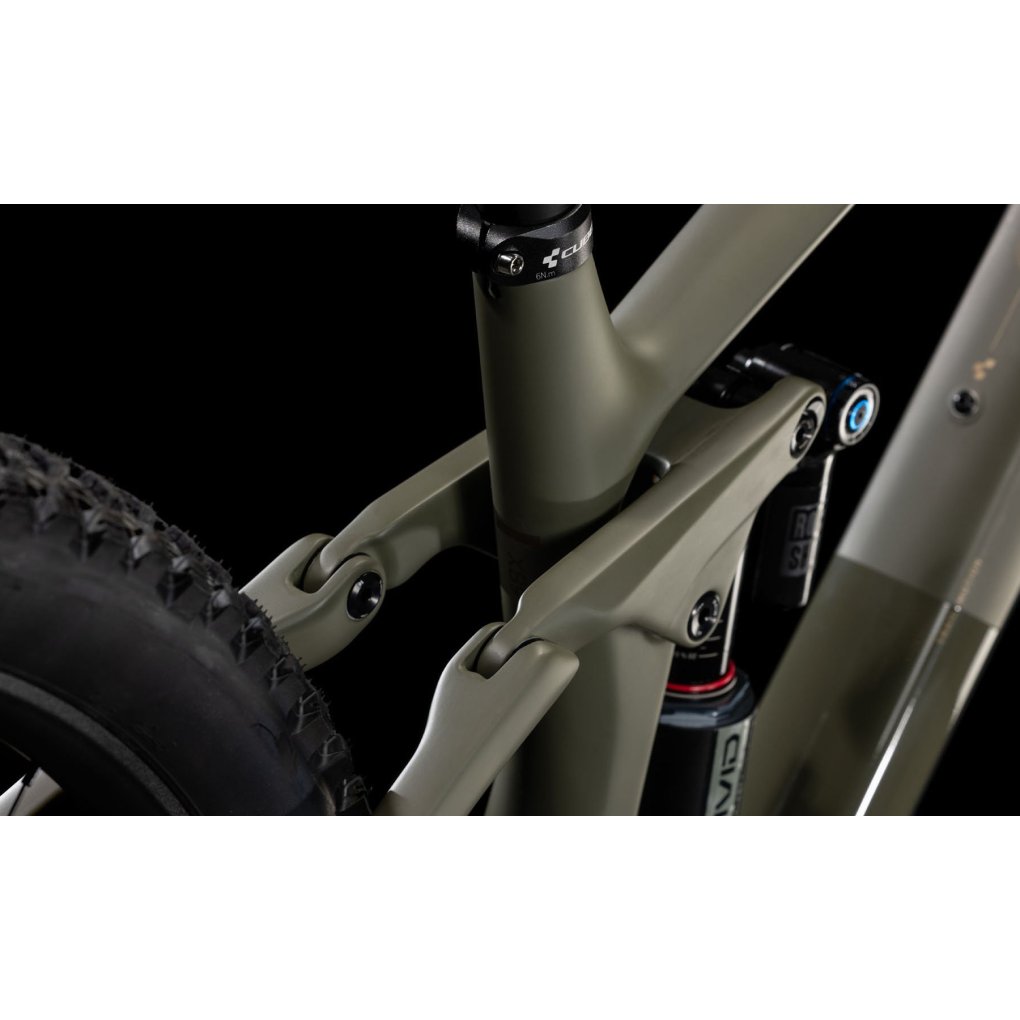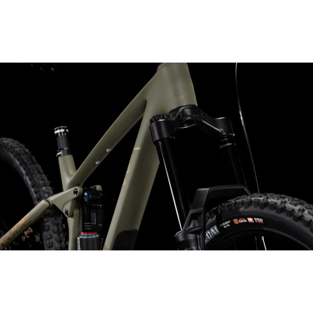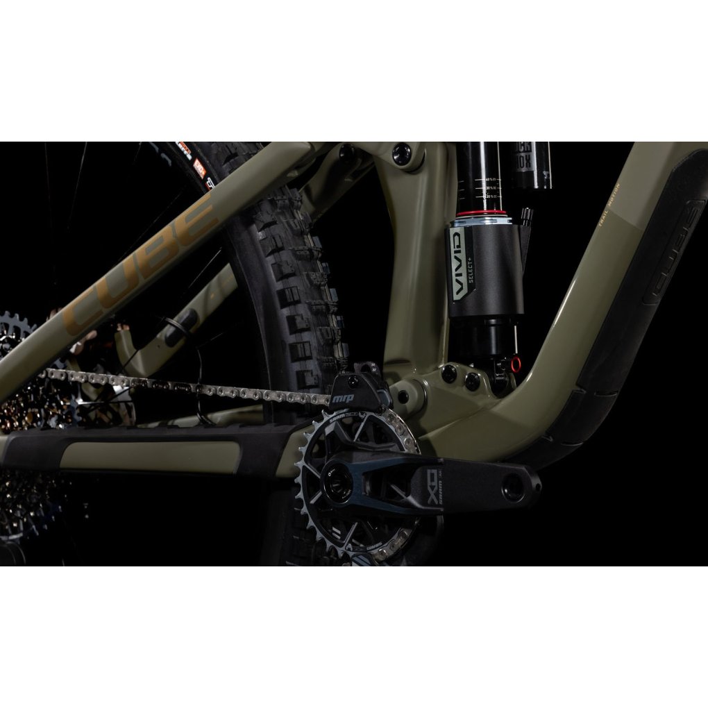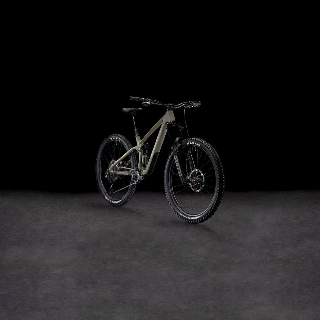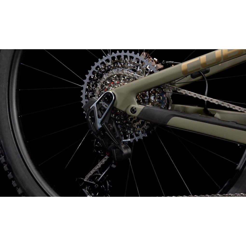 CUBE Bikes ▶ 29″ carbon MTB with RockShox fork & rear shock, 1×12-speed SRAM X0 AXS & Hayes Dominion disc brakes. ▶ Model: dustyolive / gold
