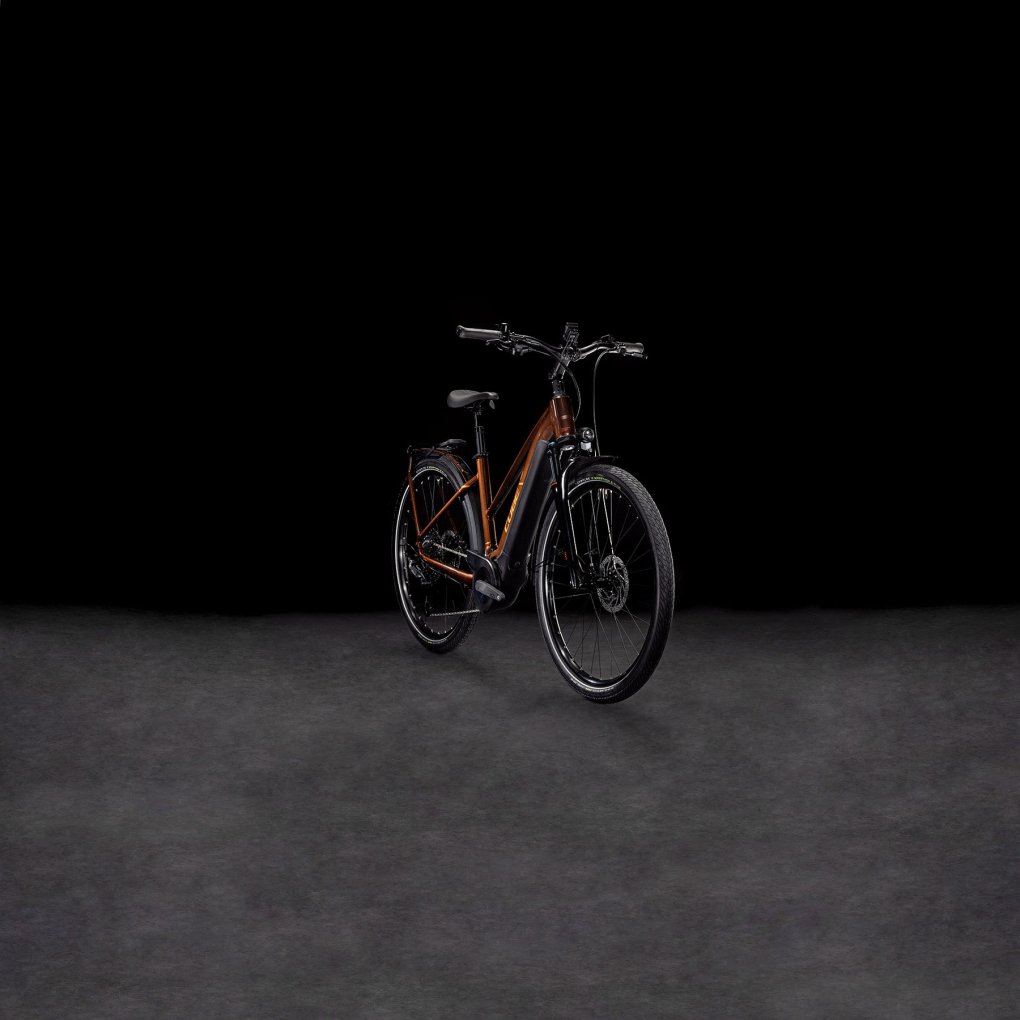 CUBE Bikes ▶ Equipped women E-bike with Bosch drive, 625Wh battery, Suntour fork and 1×11-speed Shimano Cues. ▶ Model: cinnamon / orange