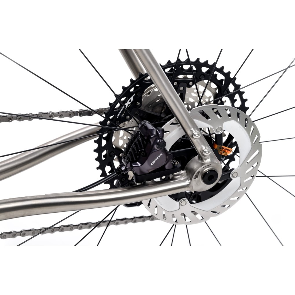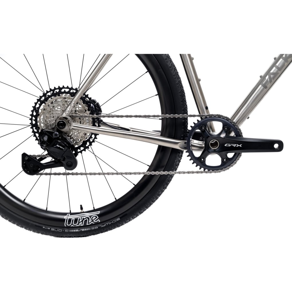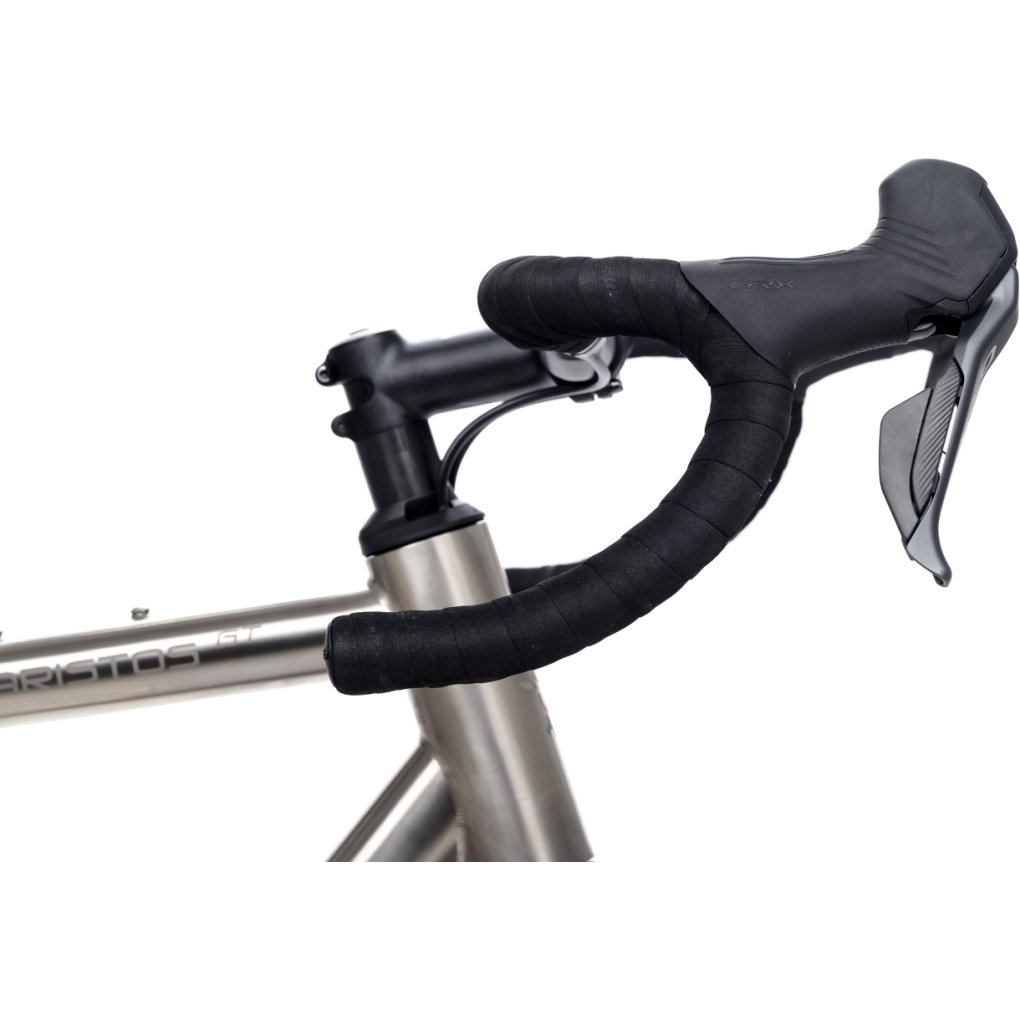 Gravel bike with titanium frame, carbon fork & Shimano GRX Di2 12-speed drivetrain.