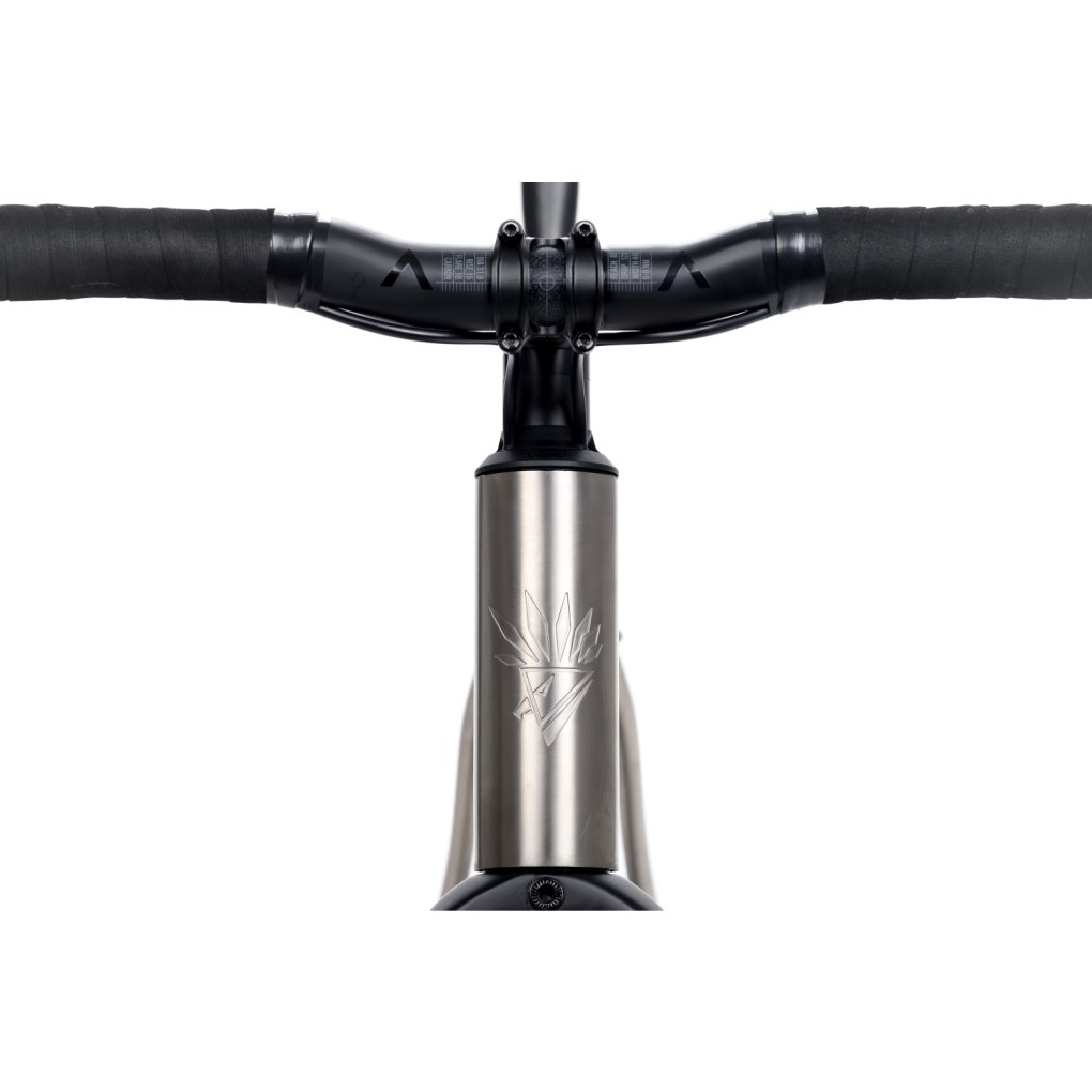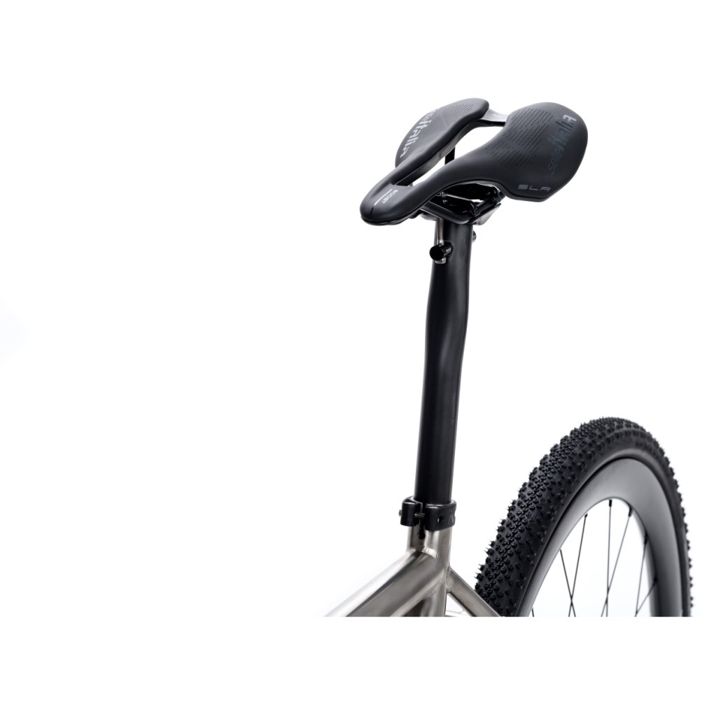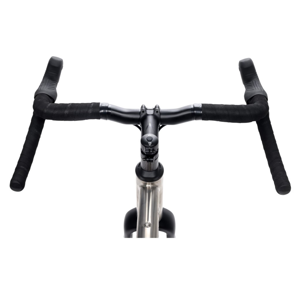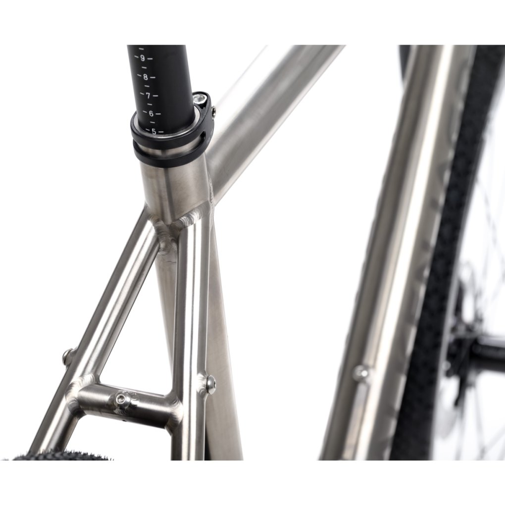 Gravel bike with titanium frame, carbon fork & Shimano GRX Di2 12-speed drivetrain.