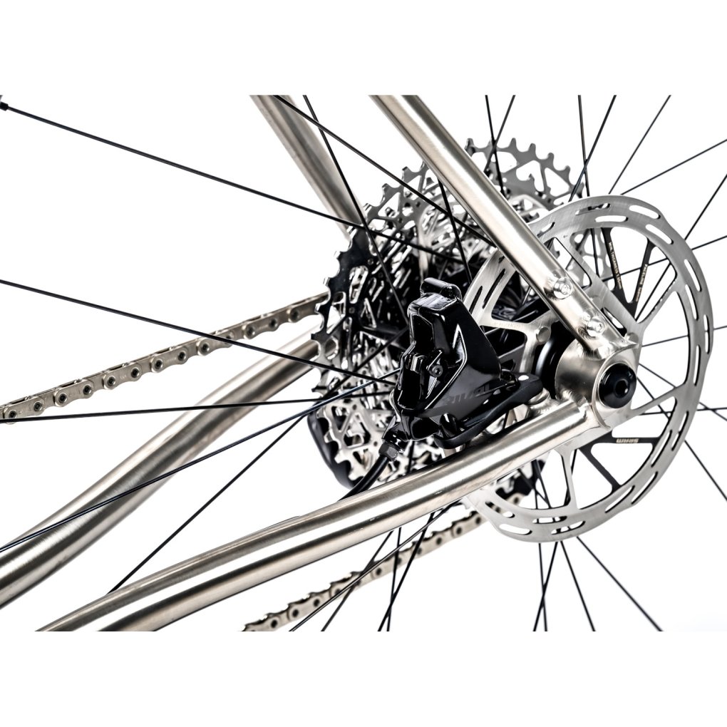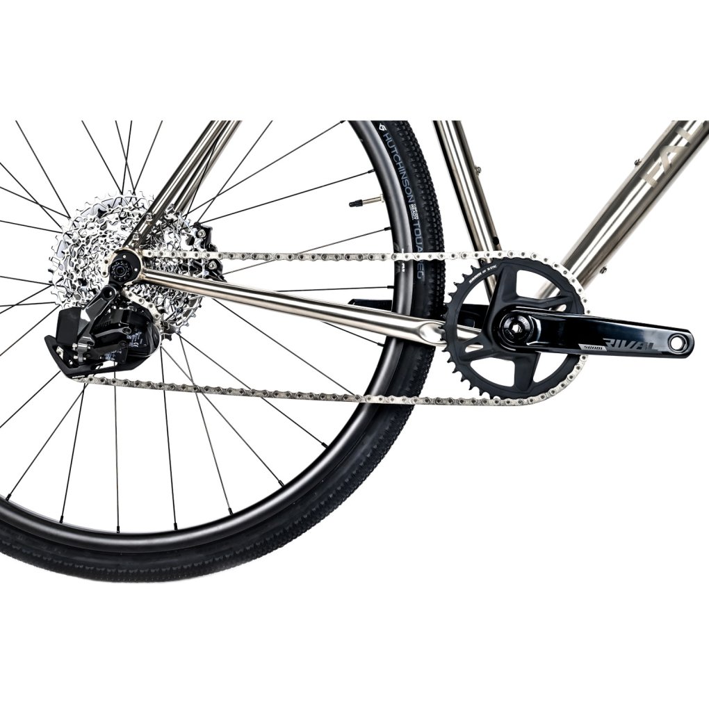 Gravel bike with titanium frame, carbon fork & SRAM Rival AXS 12-speed drivetrain.