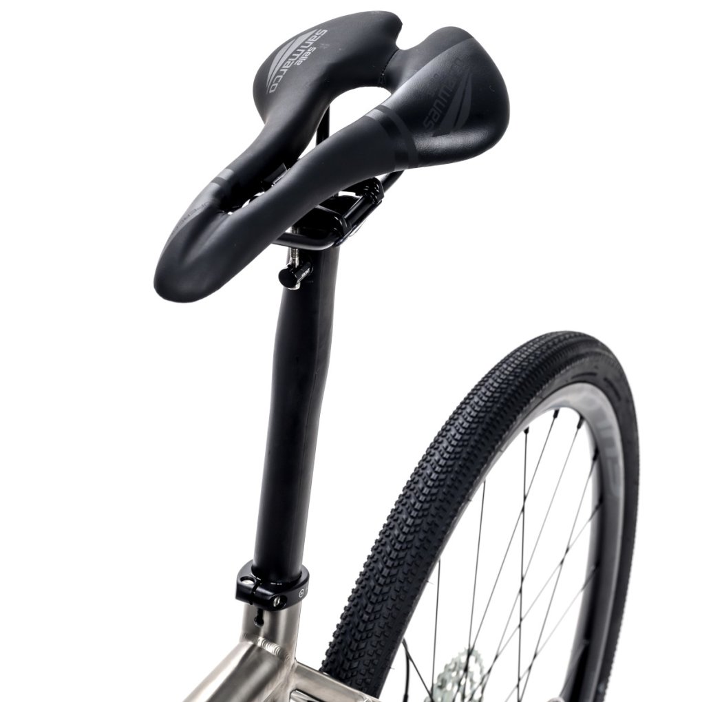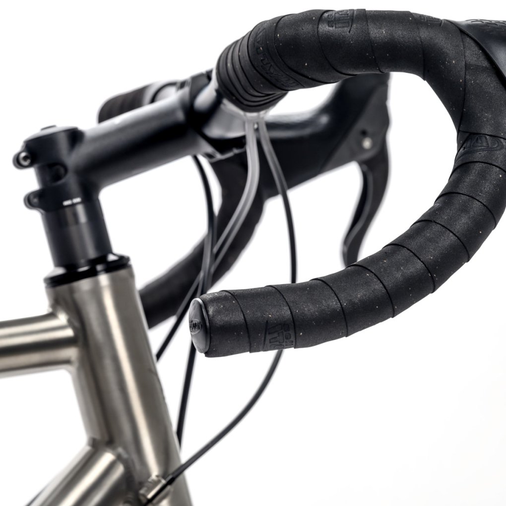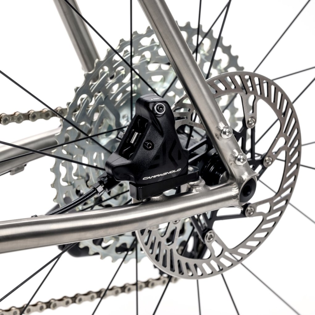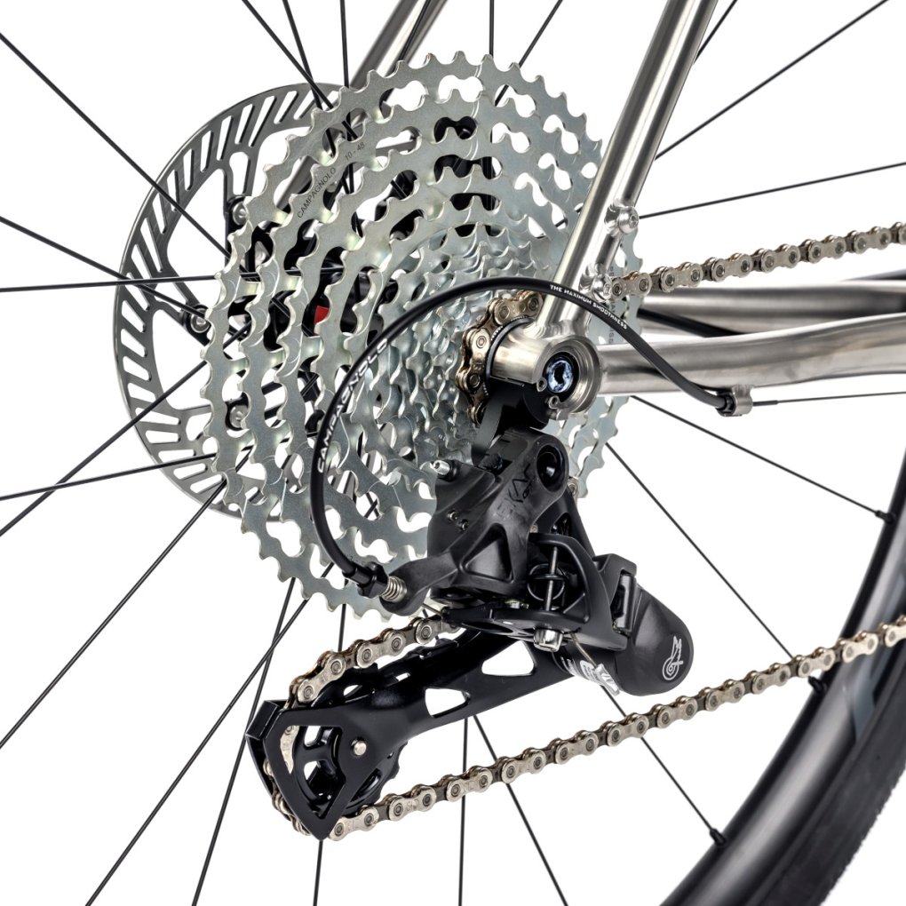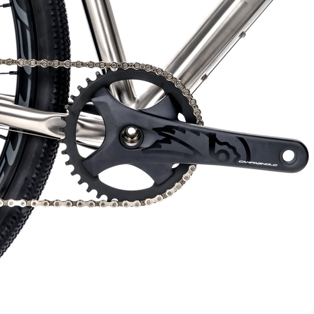 Gravel bike with titanium frame, carbon fork & Campagnolo EKAR GT drivetrain.