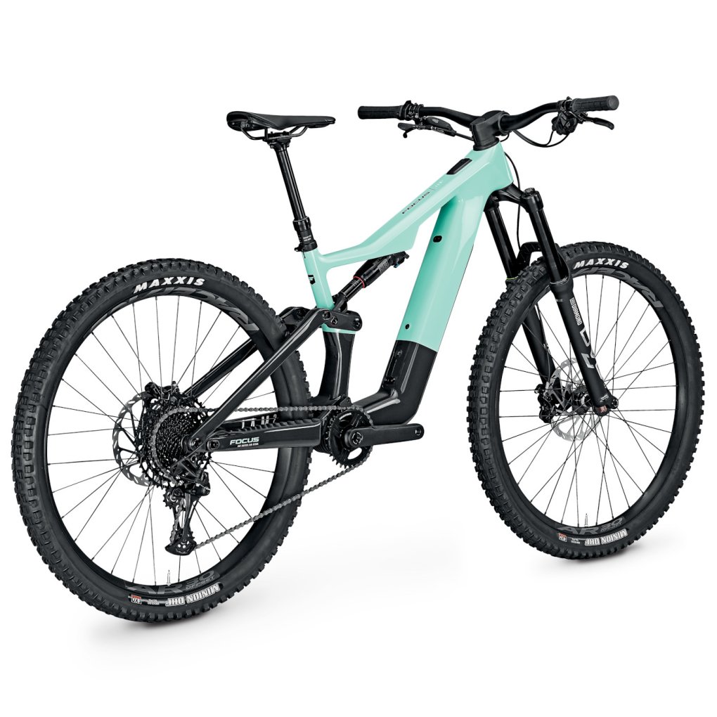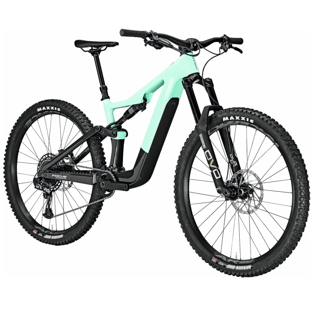FOCUS Bikes ▶ 29″ E-MTB with Fazua Ride 60 motor, 420 Wh battery, DVO fork / Rockshox shock & 1×12-speed SRAM NX Eagle. ▶ Model: Poolgreen / Carbon