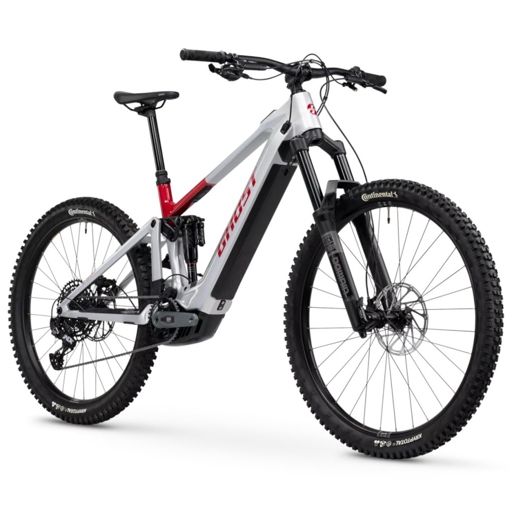 Ghost Bikes ▶ E-MTB Enduro with Fox suspension 170/160mm, Bosch motor/800Wh battery and 1×12-speed SRAM NX shifting. ▶ Model: misty grey / rebel red – glossy