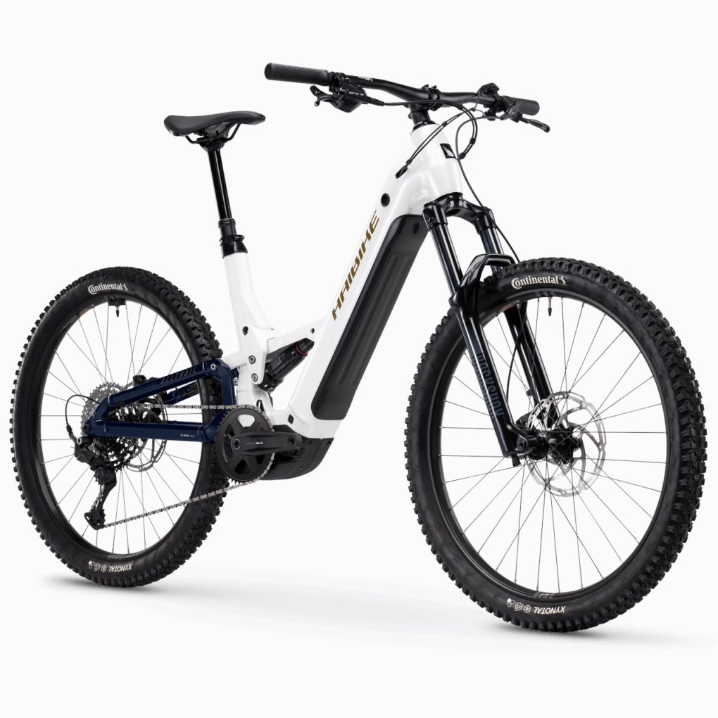 Haibike Bikes ▶ E-MTB with RockShox suspension, Shimano 11-speed gears and 600Wh battery capacity. ▶ Model: white/blue/gold – glossy