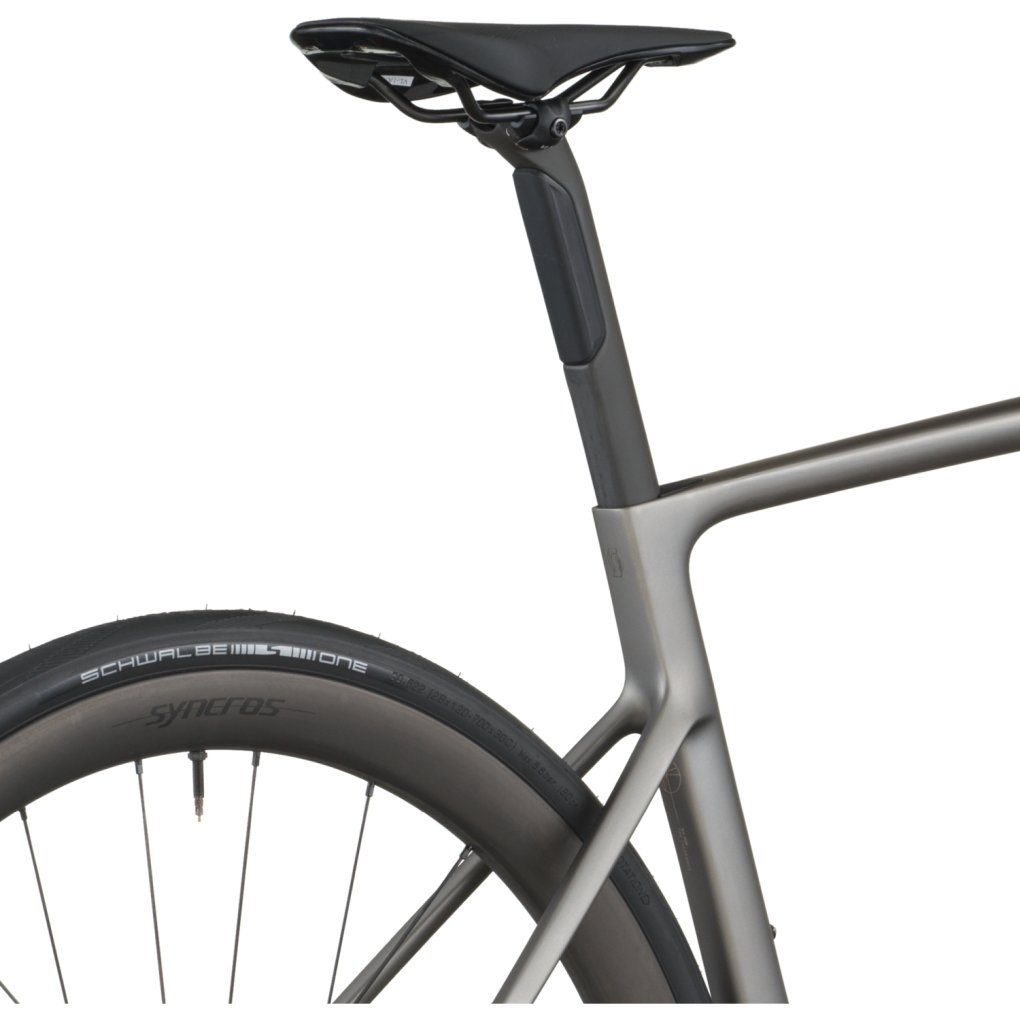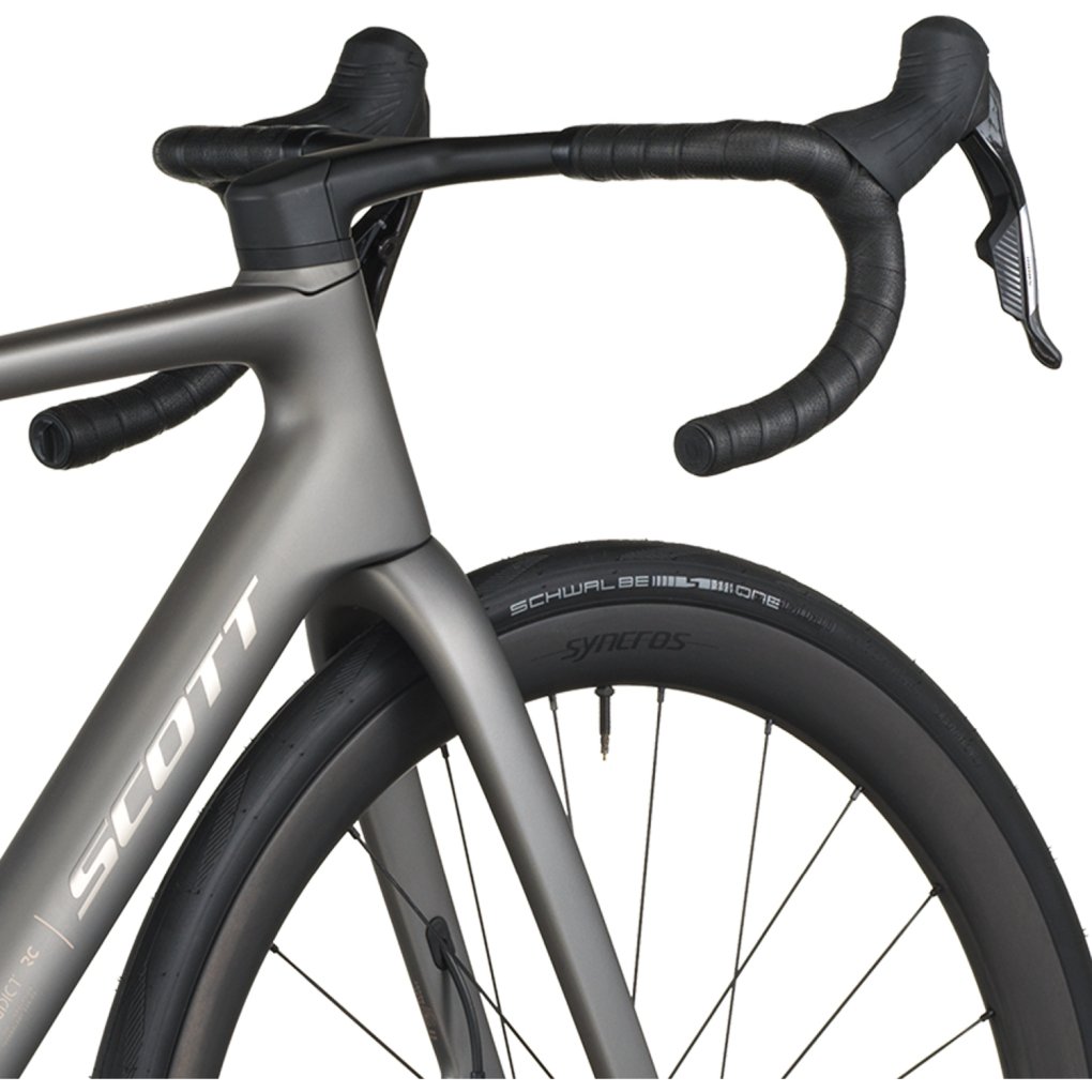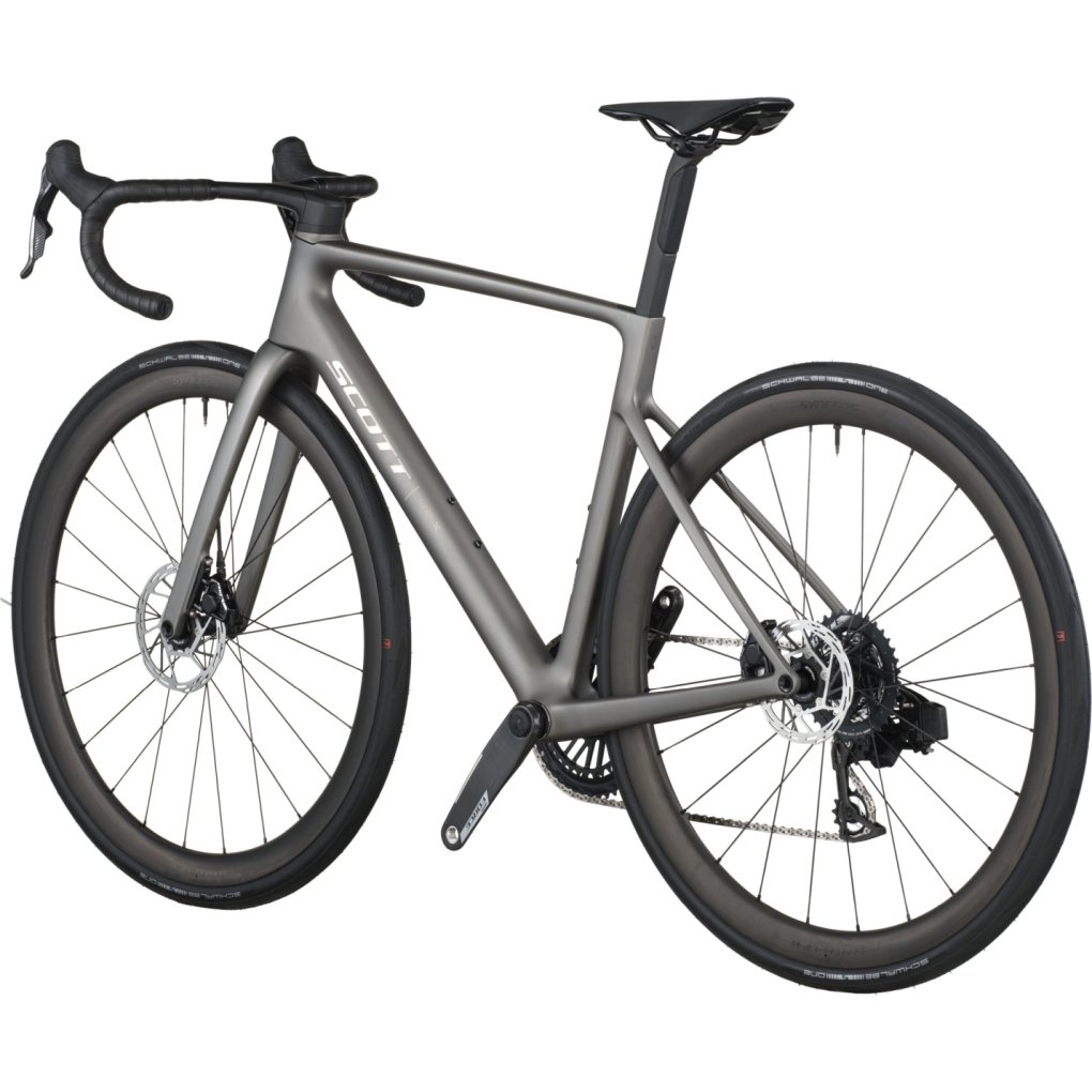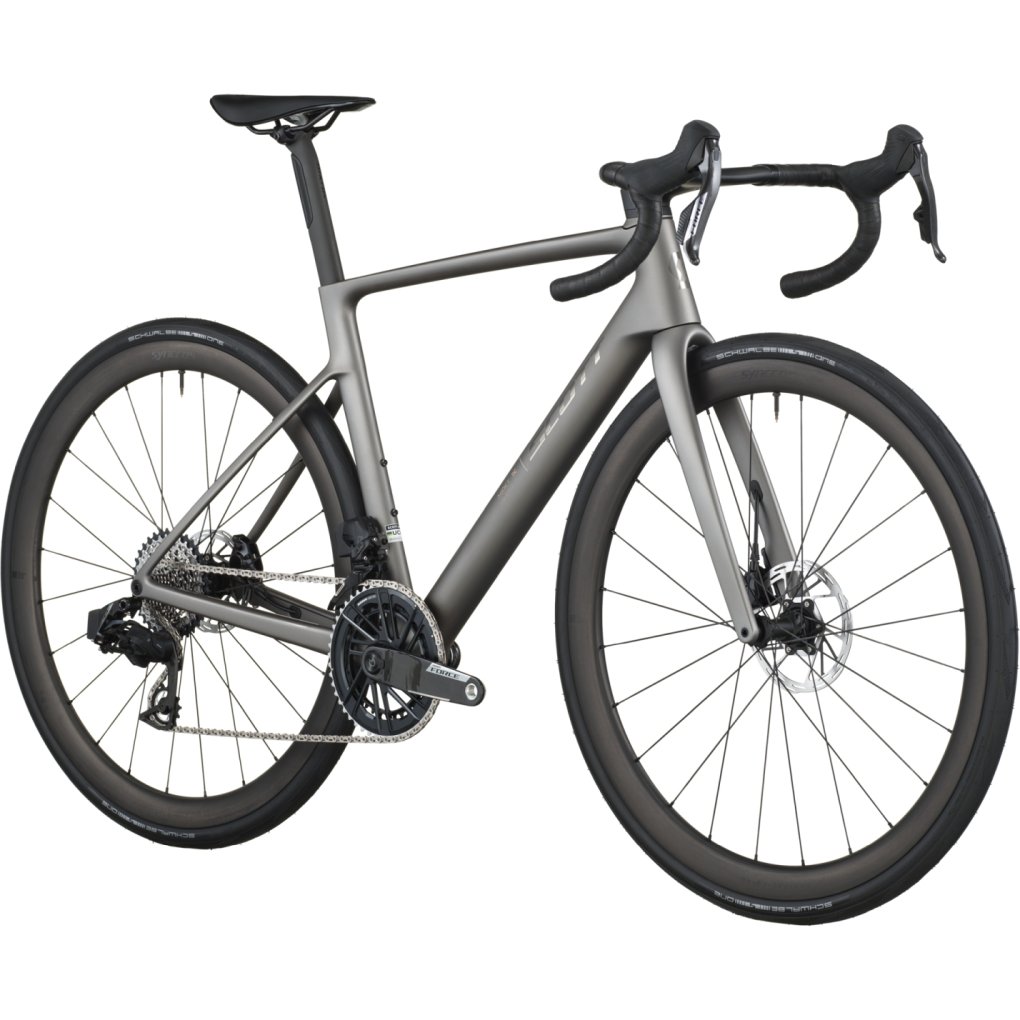 SCOTT Bikes ▶ Carbon road bike with SRAM Force AXS 2×12-speed drivetrain & Syncros components. ▶ Model: tungsten grey