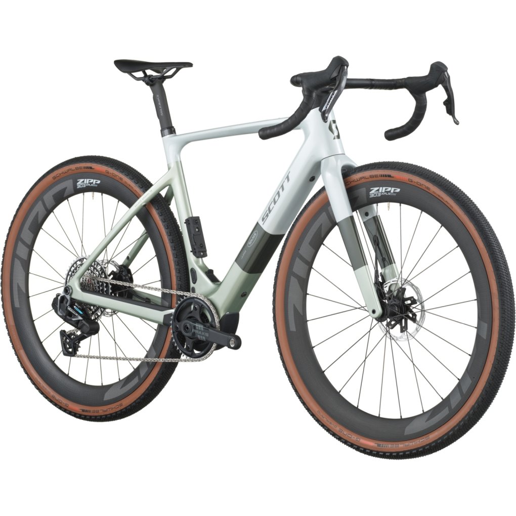 SCOTT Bikes ▶ Gravel e-bike with frame & fork made of HMX carbon, TQ HPR60 drive unit, 360Wh battery & 160wh range extender. ▶ Model: pale green / beluga grey