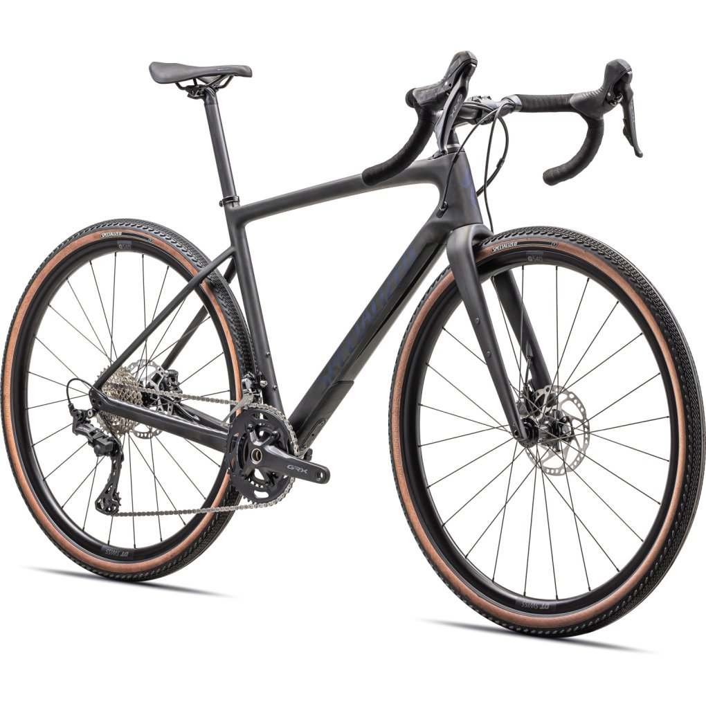 Specialized Bikes ▶ Carbon gravel bike with Shimano GRX 2×12-speed drivetrain & Future Shock carbon fork. ▶ Model: satin carbon / blue onyx
