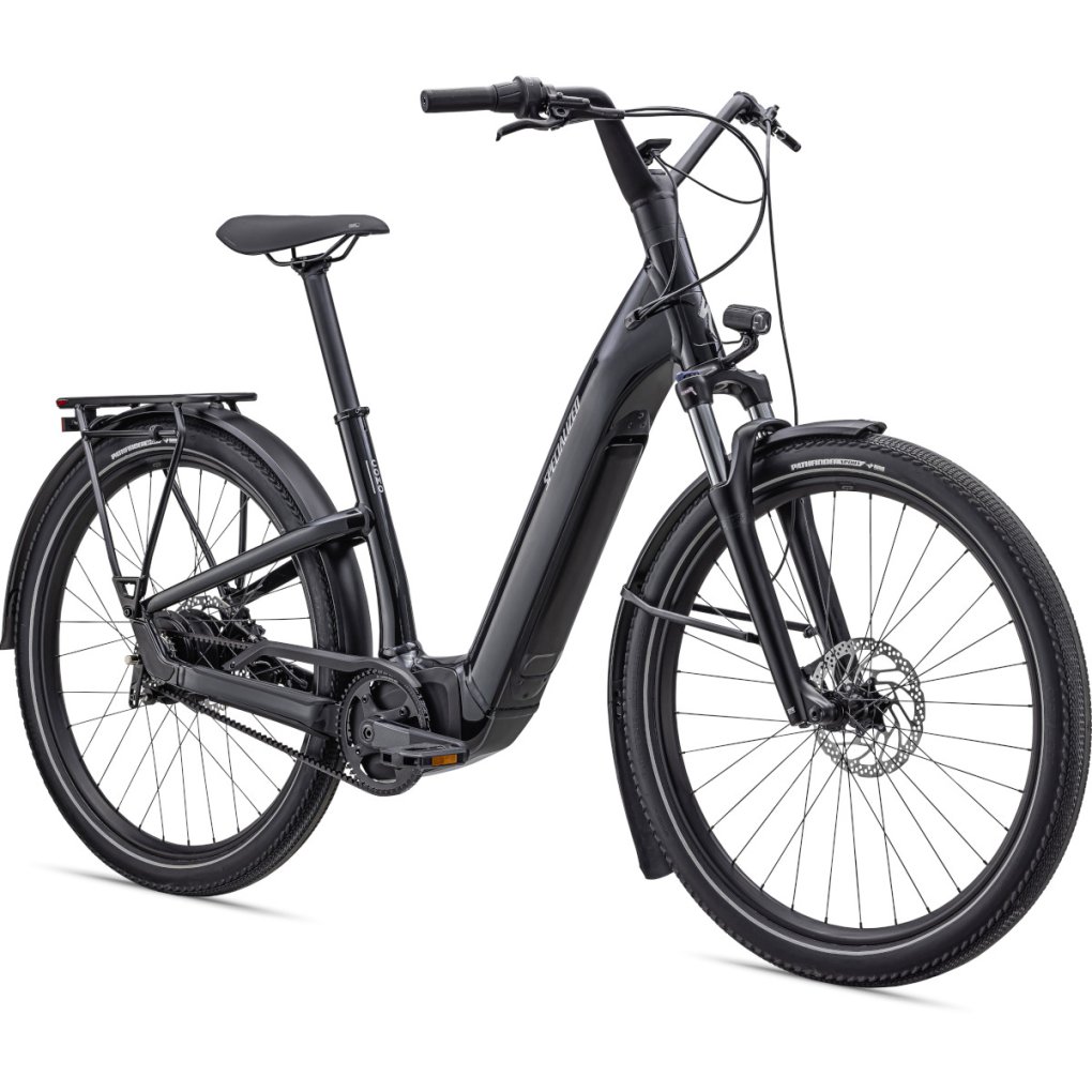Specialized Bikes ▶ City e-bike with Specialized 2.0E motor, Enviolo City hub gears, mudguards, lights & rack. ▶ Model: cast black / silver reflective