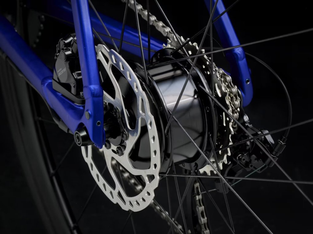 Trek Bikes ▶ Domane+ AL 5: E-road bike with HyDrive drive support system and integrated 250-Wh battery pack ▶ Model: Matte Hex Blue